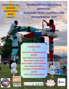Bindlestiff’s annual summer Artists-in-Residence, the Kaisokah Moko Jumbies USA, will perform at Hudson’s Waterfront Wednesday. Featured with global music star Tyla on the BET Awards, the Kaisokah Moko Jumbies will perform their mind-blowing stilt dance, accompanied by youth participants from Bindlestiff’s Summer Cirkus Stilts intensive. Don’t miss it!